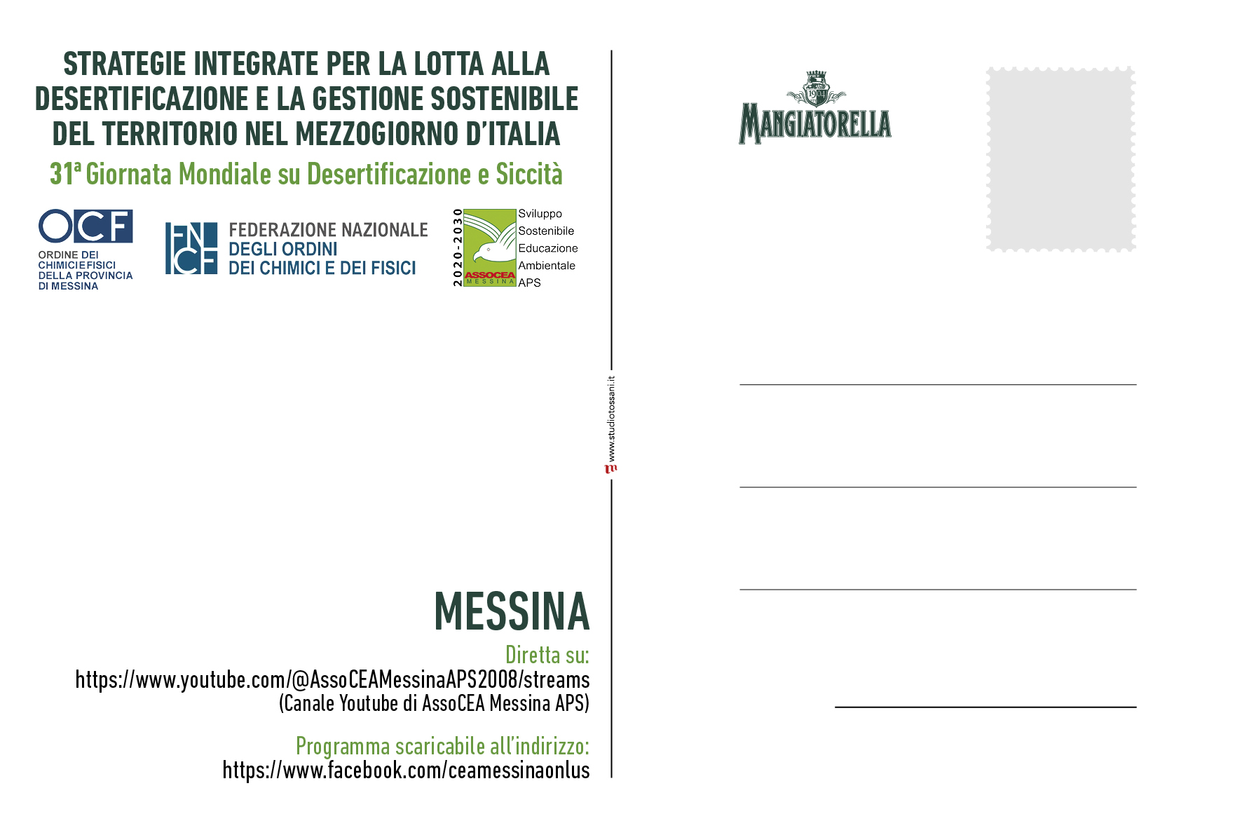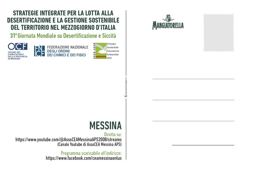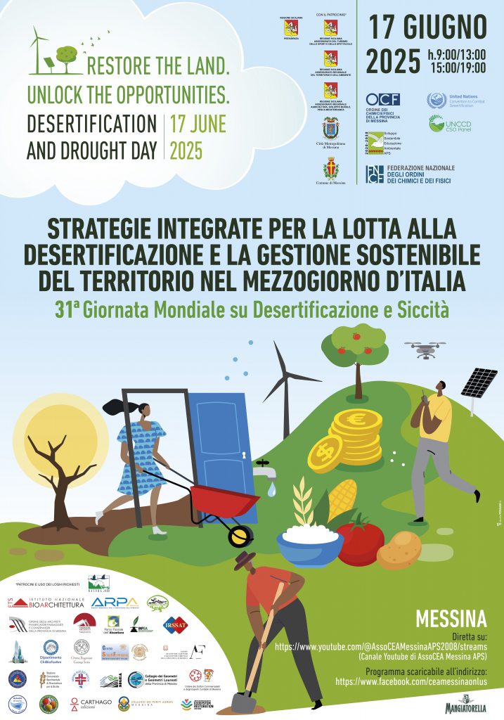 Si terrà martedì 17 giugno 2025, in occasione della della XXXI Giornata Mondiale per la Lotta alla Desertificazione e alla Siccità, il convegno “Strategie integrate per la lotta alla desertificazione e la gestione sostenibile del territorio nel Mezzogiorno d’Italia”. Organizzato dal nostro Ordine, in collaborazione con AssoCEA Messina APS e in partenariato con il Nodo InFEA della Città Metropolitana di Messina).